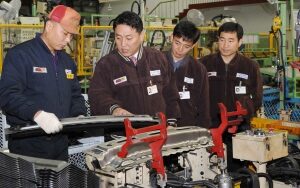 ▲ 아진산업에서 현장실무를 배우고 있는 대학생들.산학 협력이 '괜찮은 일자리'를 만드는 대안으로 주목받고 있다. 기업은 유..
