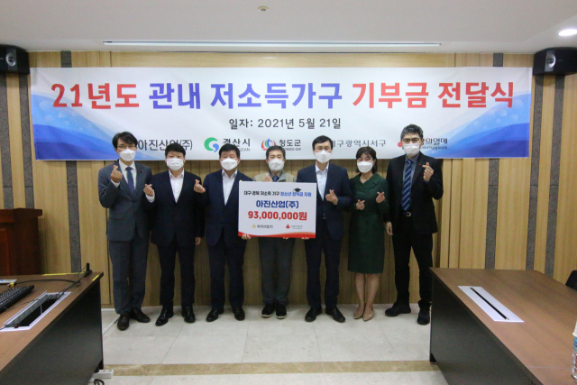대구경북 저소득 가구 청소년을 위한 지역 기업의 통 큰 기부금 전달이 이뤄졌다.경산 소재 아진산업㈜은 21일 저소득 가구 ..