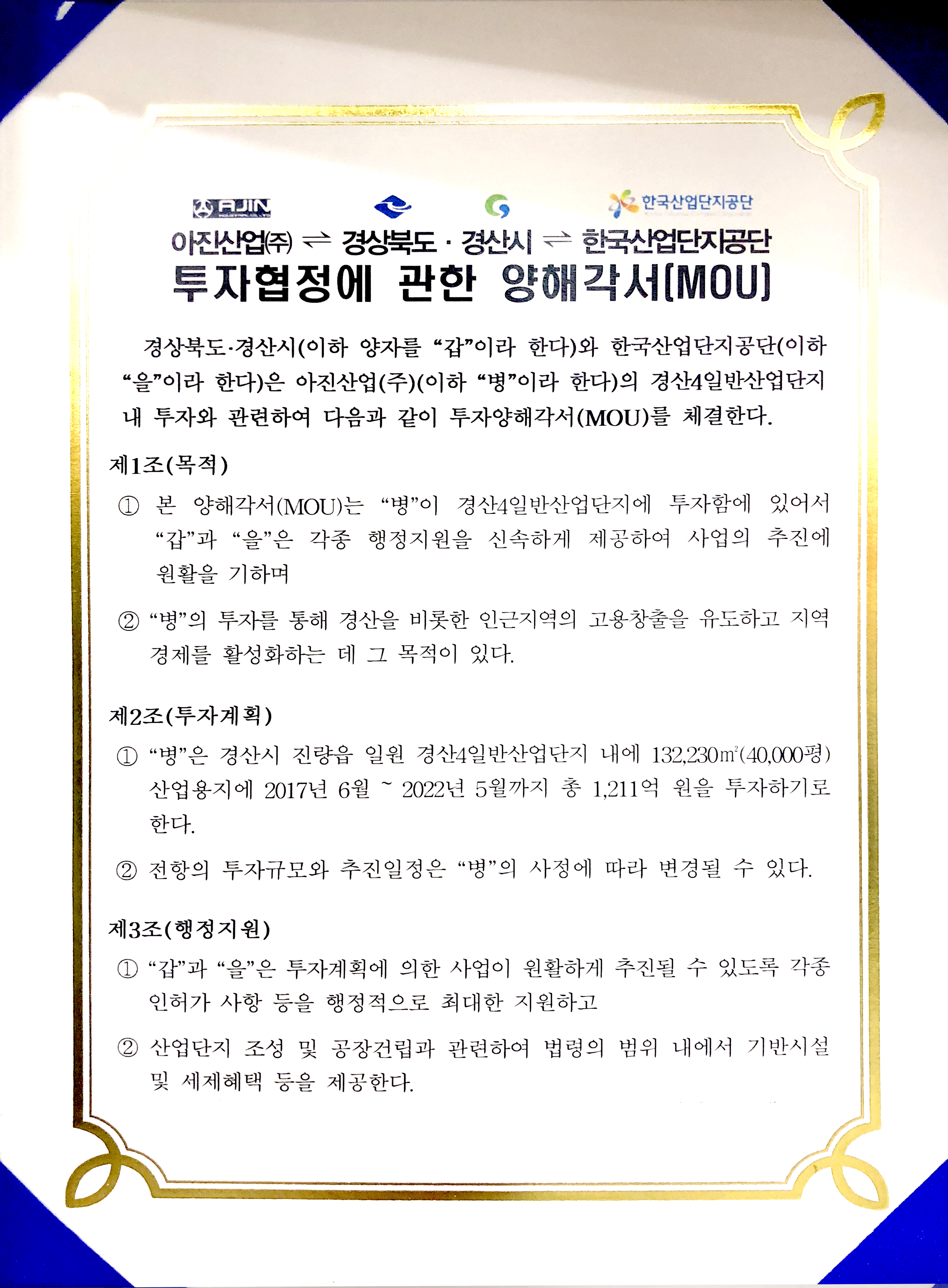 경산 4일반산업단지 투자협정 양해각서(MOU)