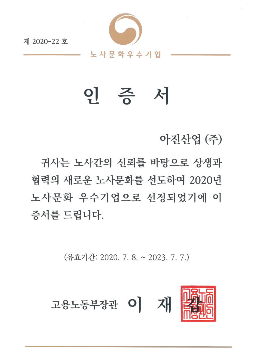 노사문화우수기업인증서 페이지 정보 작성일 20-07-08 10:32 목록 본문 2020.07.08 ~ 2023.07.07 이전글2020년 12월 18일 2020년도 노사문화 대상 20.12.18 다음글현장실습선도기업확인서 20.06.10 댓글 0 댓글목록 등록된 댓글이 없습니다.